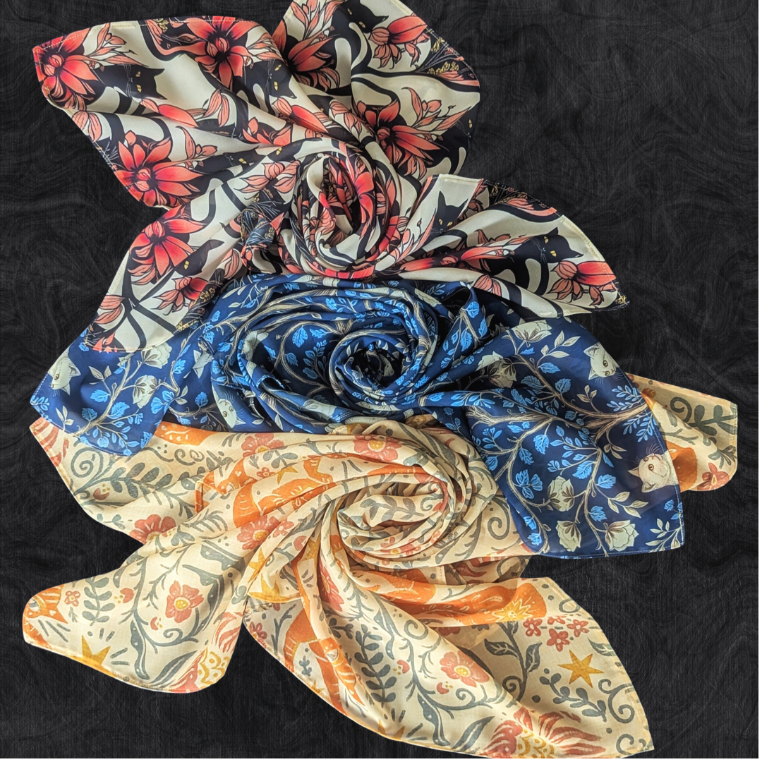 Wrap yourself in a whisper of feline-inspired elegance. Our silky chiffon scarves are more than just an accessory – they’re wearable art, created with love and a touch of Cats Out of the Bag magic.
